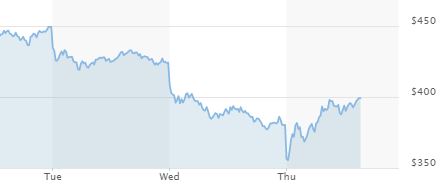 У инвесторов были большие ожидания от этой давно анонсированной презентации. Поэтому, в самом начале трансляции акции начали потихонечку подниматься в цене. Потом возникло плато и вдруг просто вертикальное падение с $450 до $395. Просто мгновенно вниз! За следующие 2 дня акции подешевели ещё немного, до $380, но потом начали подниматься опять.