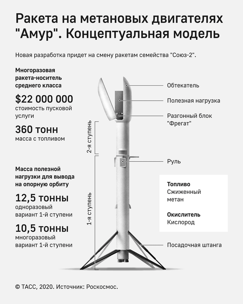 Как рассказал Пшеничников, по предварительным расчетам, метановый “Амур” получит взлетную массу около 360 тонн, высота ракеты будет достигать 55 метров, диаметр составит 4,1 метра. Носитель будет иметь возвращаемую первую ступень и вторую однократного использования, обе будут оснащаться метановыми двигателями. Многоразовый блок получит посадочные штанги, а также аэродинамические решетчатые рули. Это оборудование может быть снято для запуска в традиционной одноразовой версии. С возвращаемой ступенью “Амур” будет способен выводить на низкую околоземную орбиту до 10,5 тонн полезного груза, против 8,5 у ракет серии “Союз–2”. В одноразовом варианте “Амур” поднимет на туже орбиту уже 12,5 тонн.