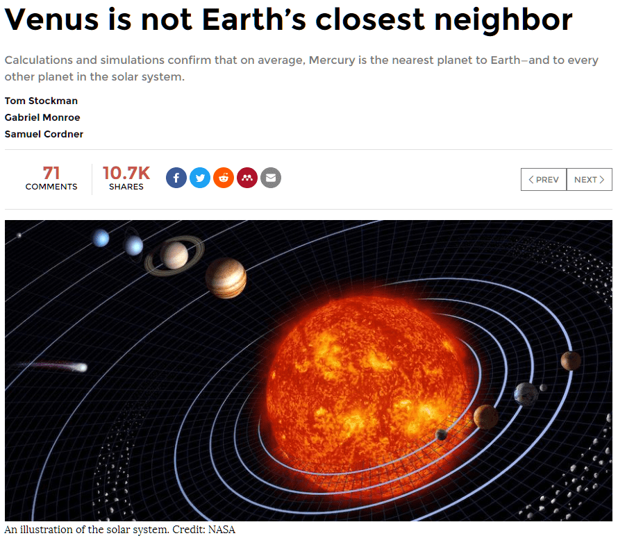 Астрономы аккуратно посчитали среднее расстояние между Землей и другими планетами Солнечной системы на основе давно известных данных. Для этого они отказались от стандартного сравнения радиуса орбит, расстояния от планеты до Солнца. Оказалось, что в среднем ближе всего к Земле находится не Венера и не Марс, а Меркурий.