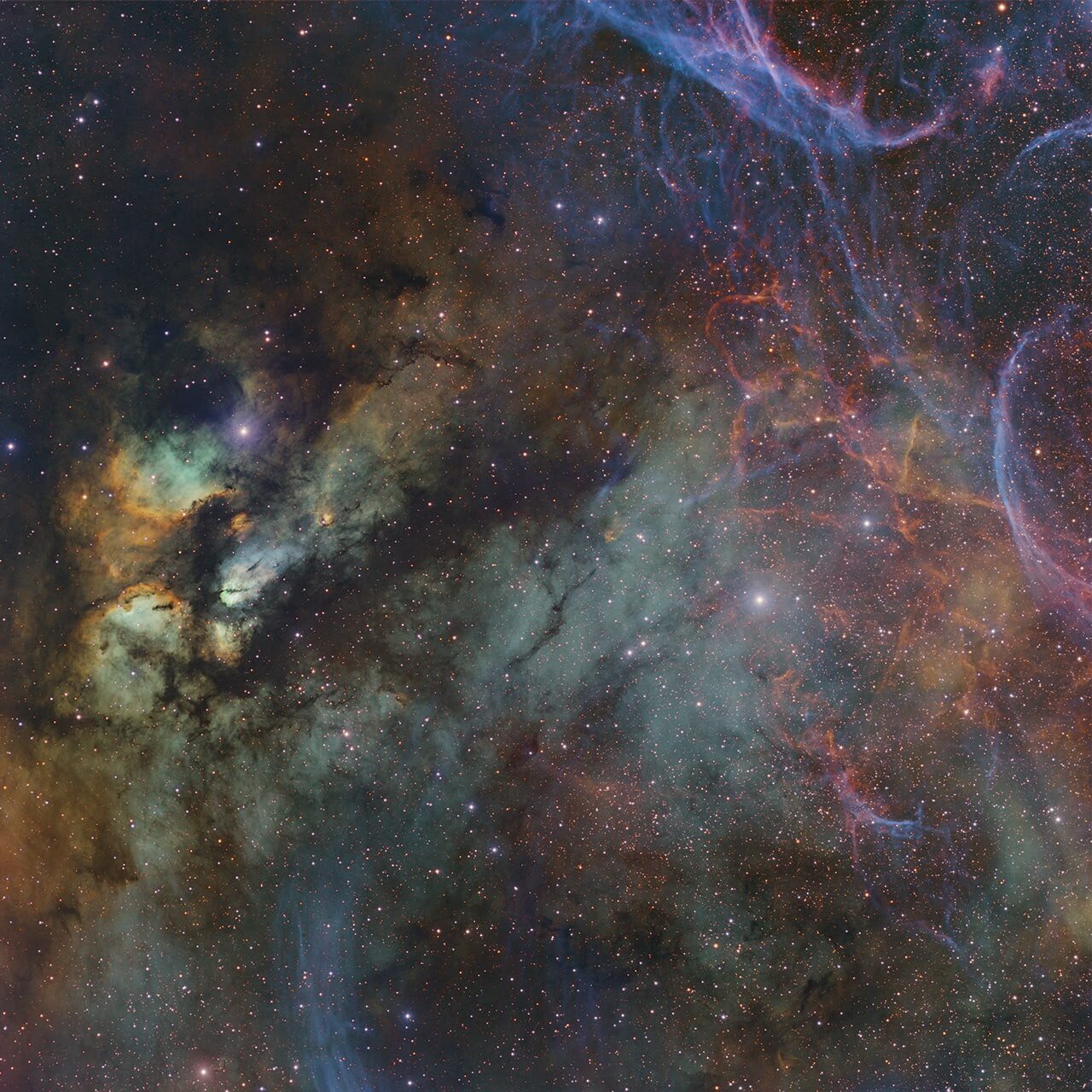 Takahashi FSQ-106EDX4 telescope at f/5, Astronomik L, Ha, OIII & RGB filters, Astro-Physics 1600GTO German Equatorial mount, FLI ProLine 16803 camera, 13 hours total exposure
