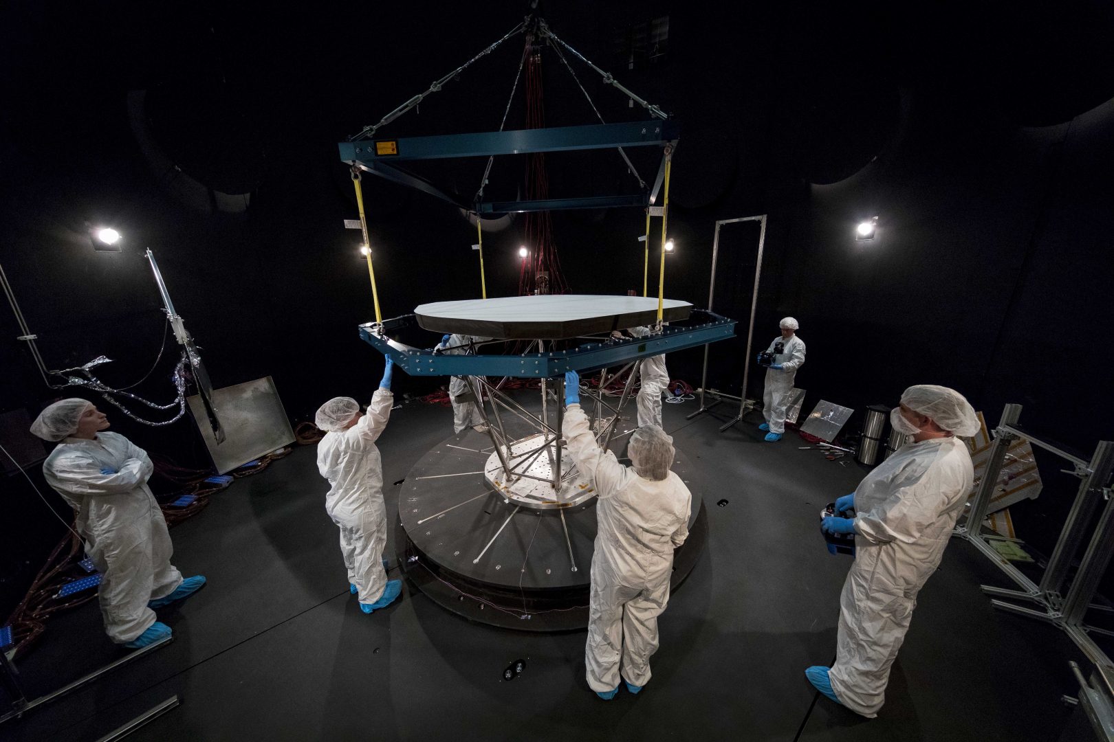 Инженеры устанавливают теплозащитный экран для проведения испытаний в вакуумной камере Центра космических полётов имени Годдарда. Credit: NASA Goddard Space Flight