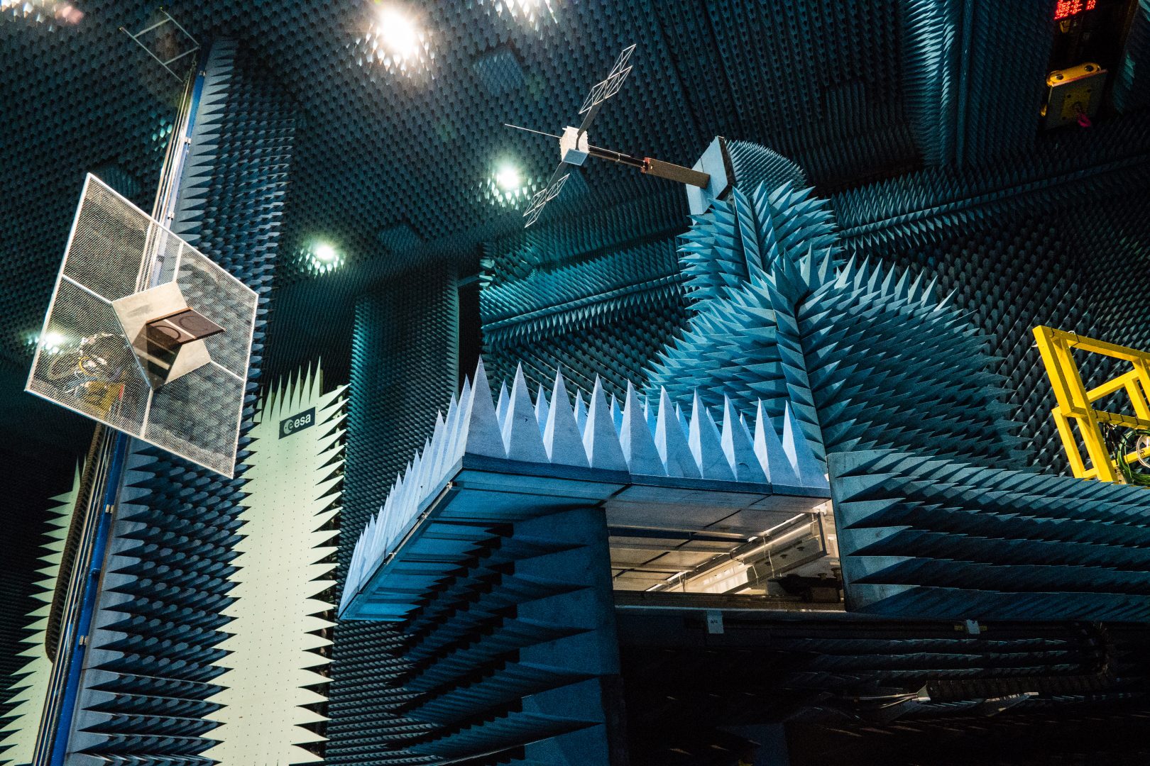 Тестирование антенны RIME для миссии JUICE. Сигнал, принимаемый антенной во время испытаний, излучался зондом, установленным на квадратной сетке слева. Credit: ESA–M. Cowan