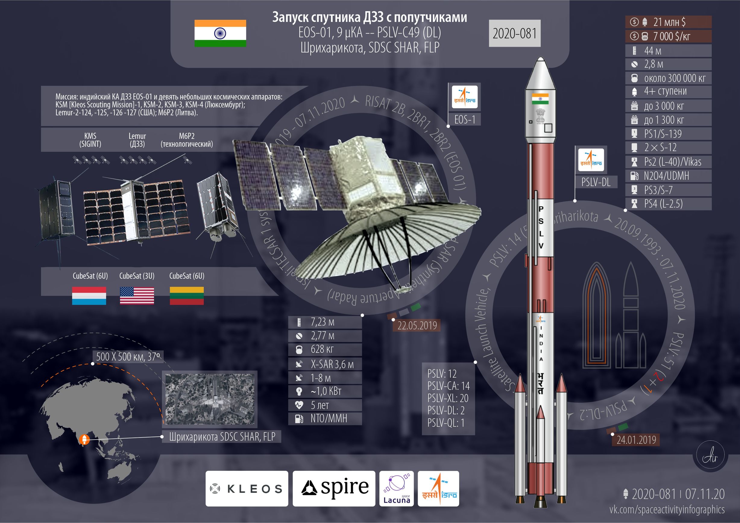 Индия. Радиолокационный спутник с попутчиками. Первый запуск в этом году от Индии.
