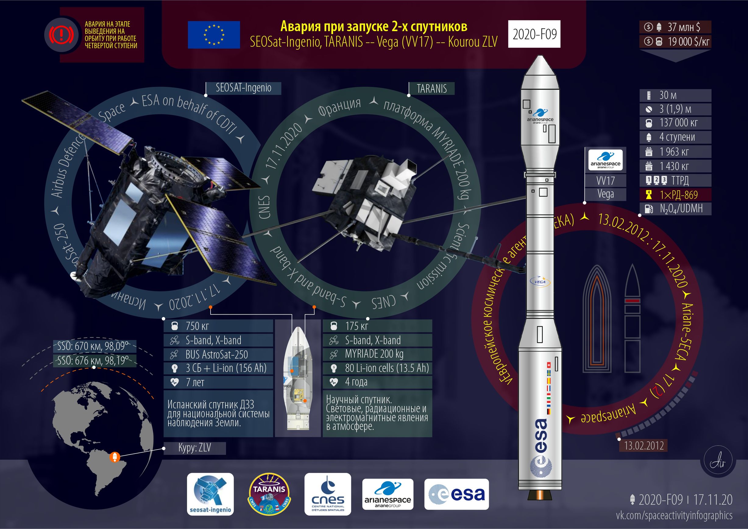 Европа. Авария при запуске VEGA. Полезные нагрузки потеряны.
