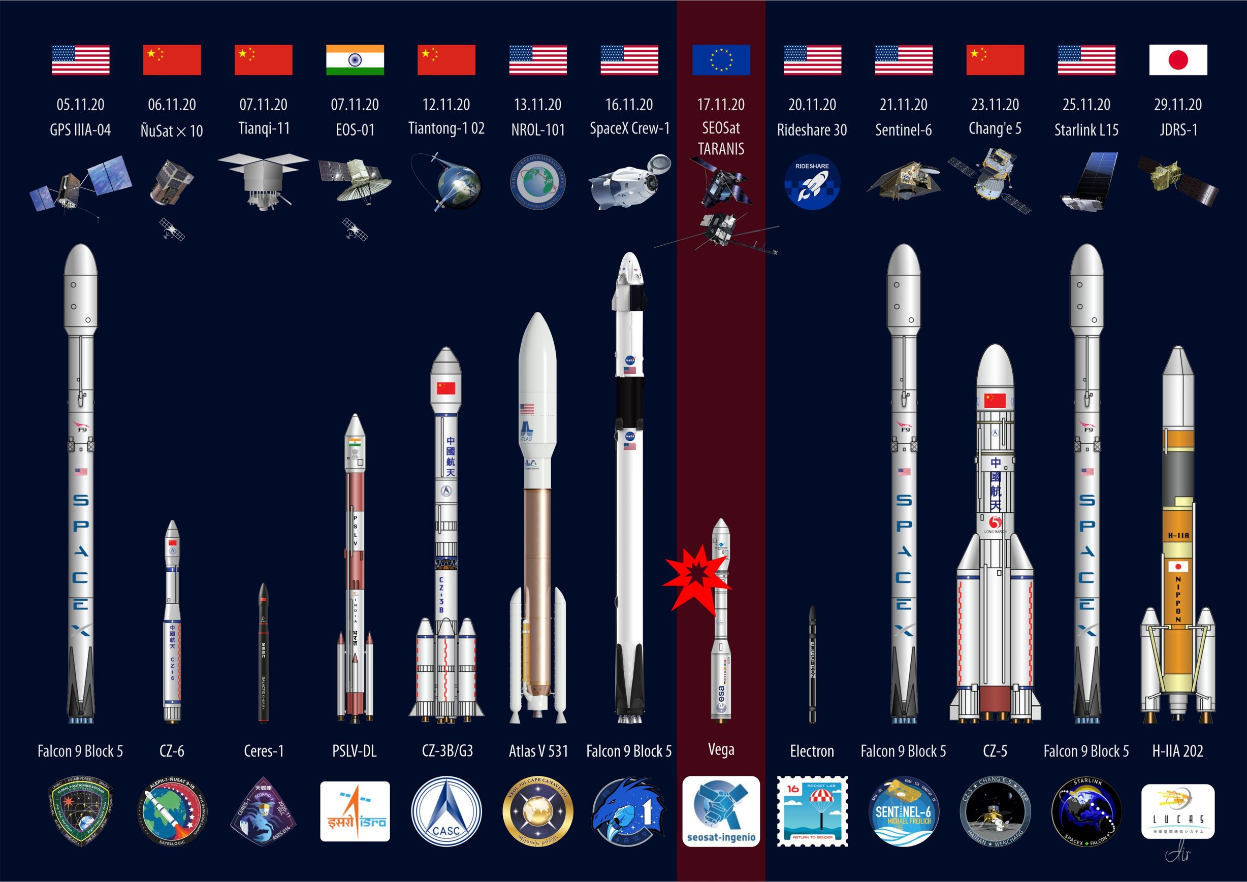 Ноябрь — месяц США и Китая. Индия (первый за год). Европа с аварией. Япония с одним запуском. Россия не запускала.