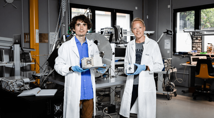 Dmytro Rafalskyi, ThrustMe chief technology officer, is holding NPT30, the firm’s modular electric propulsion system based on gridded ion thruster technology. ThrustMe CEO Ane Aanesland is holding I2T5, the firm’s new cold gas thruster. Credit: ThrustMe