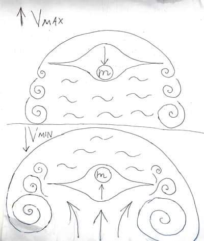 Выделив из общего ритма один такой цикл, можно сказать, что крыло своей передней частью сообщает воздуху импульс в направлении вперед вверх, расталкивая его над собой. В результате этого над крылом образуется область пониженного давления, схлопывание которой происходит в направлении импульса.  Из-за того, что крыло находится на пути устремляющегося в разреженность над ним воздуха, оно получает  импульс направленный вперед вверх. Ламинарный профиль является более скоростным потому, что наклон его задней нижней плоскости позволяет  импульсу схлопывания полости толкать крыло в направлении полёта.