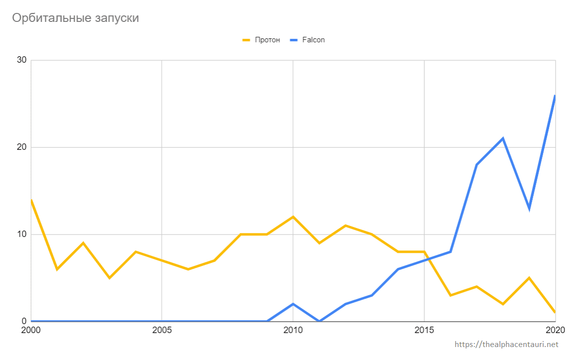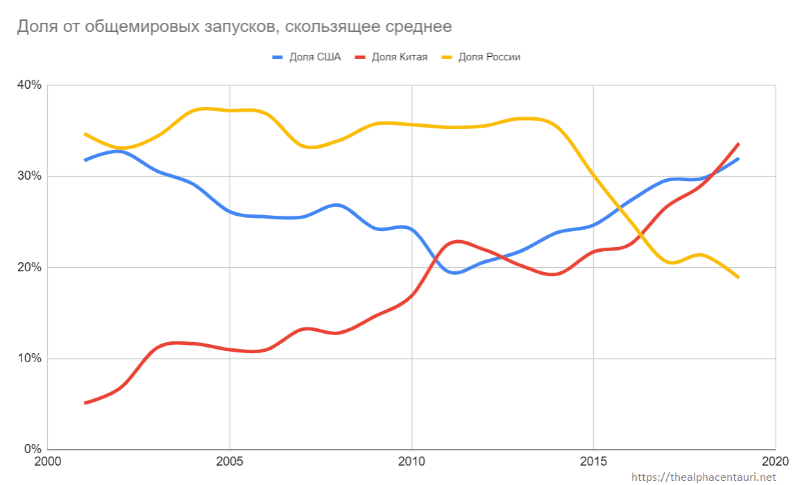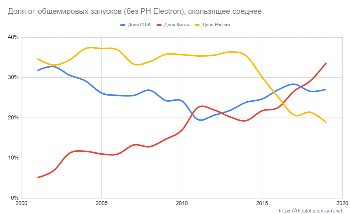 Падение доли России имеет очевидные причины — американские коммерческие запускиОбратите внимание на 2014. Резкое начало падения количества рос запусков. Там же и проседание графика у США. Ваше предположение притянуто за уши. Вспоминайте 2014 ! Вы не совершили никакой роковой ошибки в тот год?