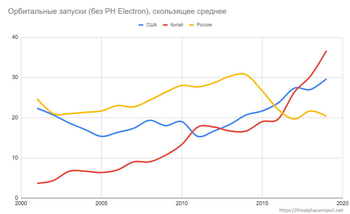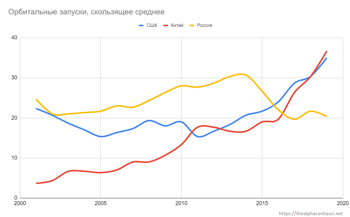У Китая реальный рост числа пусков. Более значительный чем у США. Но в исследованиях дальнего космоса, по прежнему слабаки.