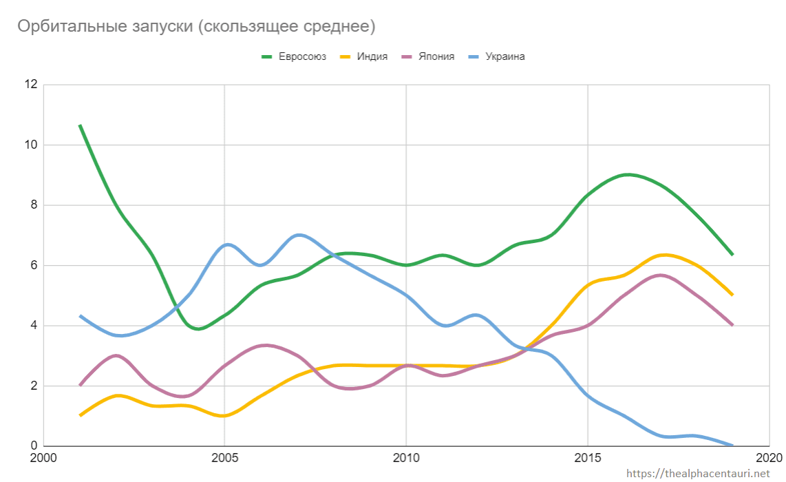 Для полной картины осталось выяснить, как обстоят дела у других стран. Четыре страны совершает орбитальные запуски более-менее регулярно: Евросоюз, Индия, Япония и Украина.