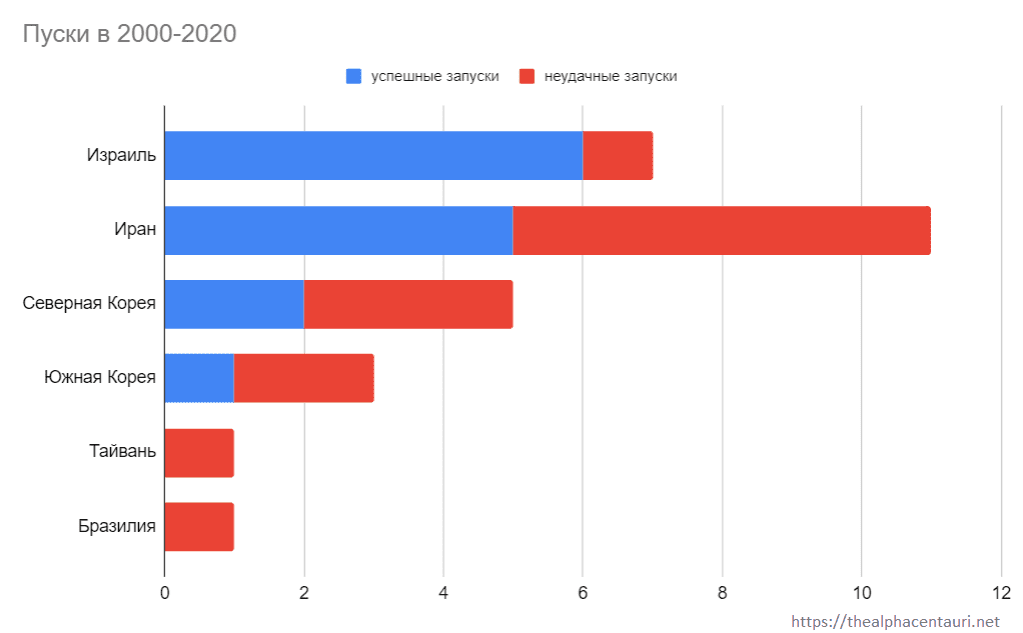 Кроме того, ряд стран совершает пуски ещё реже. По найденной мной информации, ещё 6 стран предпринимали попытки совершить орбитальный запуск: Израиль, Иран, Северная и Южная Кореи, Тайвань и Бразилия. Многие из попыток завершились неудачно.