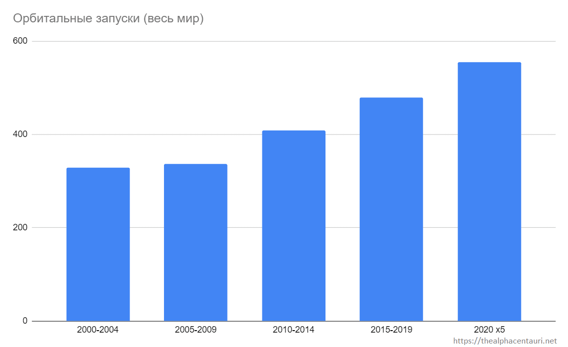 Для тех, кто “шарит за космос”, тут вряд ли найдётся что-то принципиально новое. Я просто собрал все цифры в одной табличке и попытался сделать из них простую, наглядную и актуальную инфографику, которая даст понимание того, что происходило в сфере запусков последние 20 лет. Ну, и ещё эти графики можно показывать людям, занимающим различные сомнительные позиции.