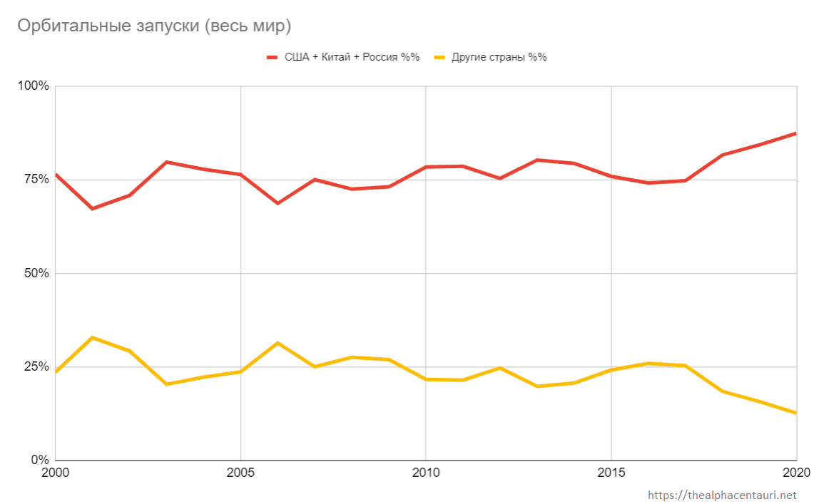 Внесём поправку на то, что общее количество запусков растёт, и посмотрим, какой процент запусков из общемировых совершают страны из “большой тройки”.