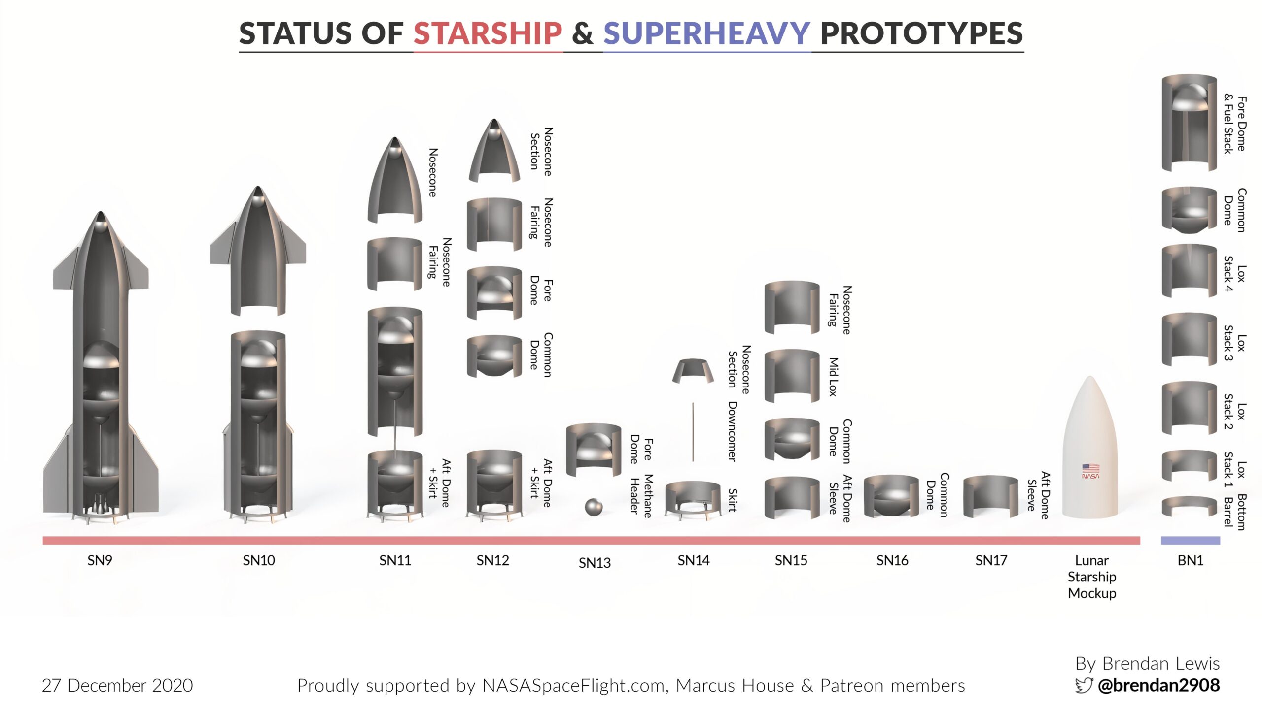 На конец года мы имеем 12 списанных прототипов или их частей, один – в процессе предполетных испытаний и еще 8 строятся, не считая прототипа бустера, который уже начали собирать, и макета кабины лунного корабля, который, судя по всему, готовят к презентации для NASA в ферале 2021. Пожелаем новых достижений в 2021!