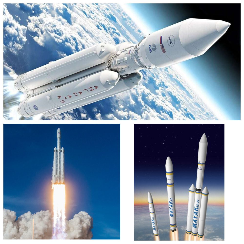 Российская Ангара (сверху) , Falcon Heavy Илона Маска (слева), и главный герой — статьи РН Маяк Украины (справа).