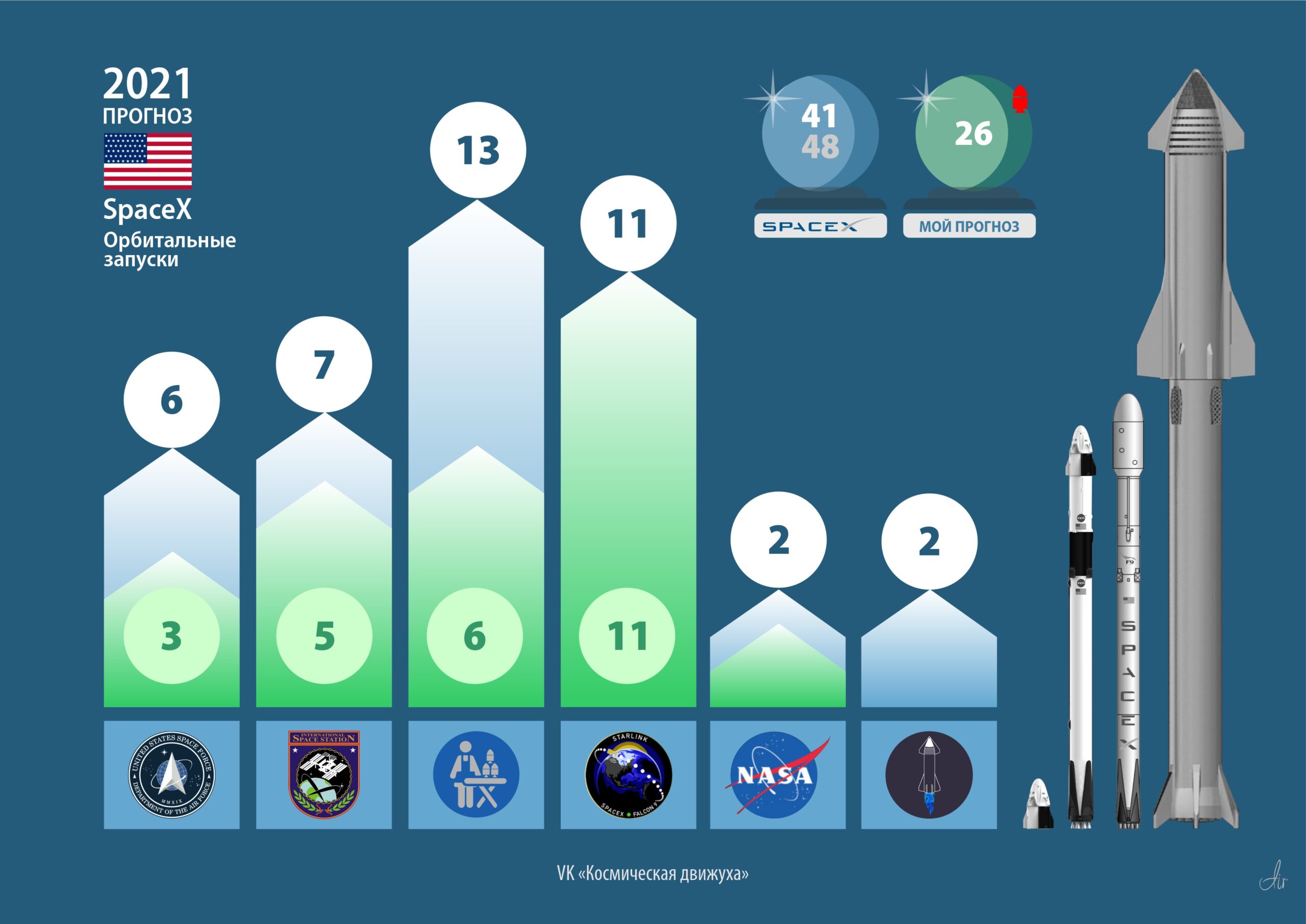 SpaceX (Falcon 9, Falcon Heavy, SS): заявлено 41. Мой прогноз — 26. Возможна авария.