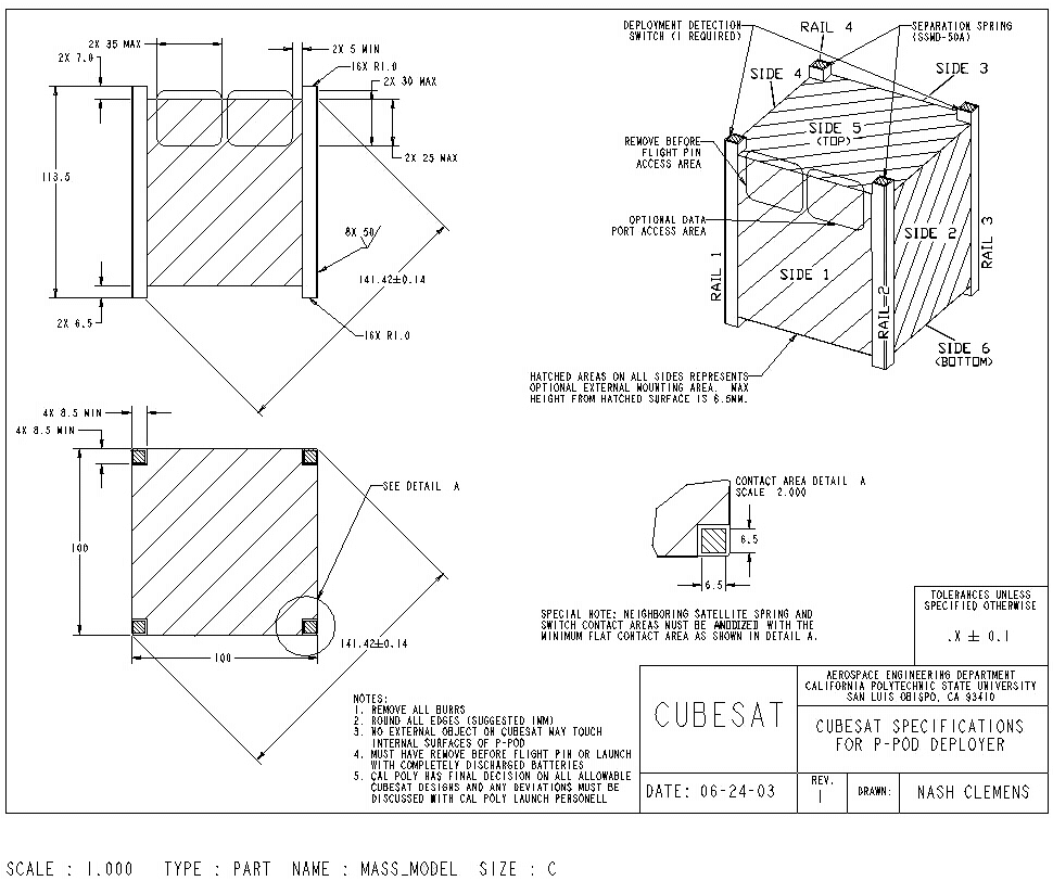 А вместе с ней и спецификация на сами пикоспутники, названные за кубическую форму CubeSat. Их масса не должна была превышать 1 кг (что и делало их именно “пико”), а размеры – 113,5x100x100 мм, из которых только 100x100x100 мм приходятся на полезный объём.