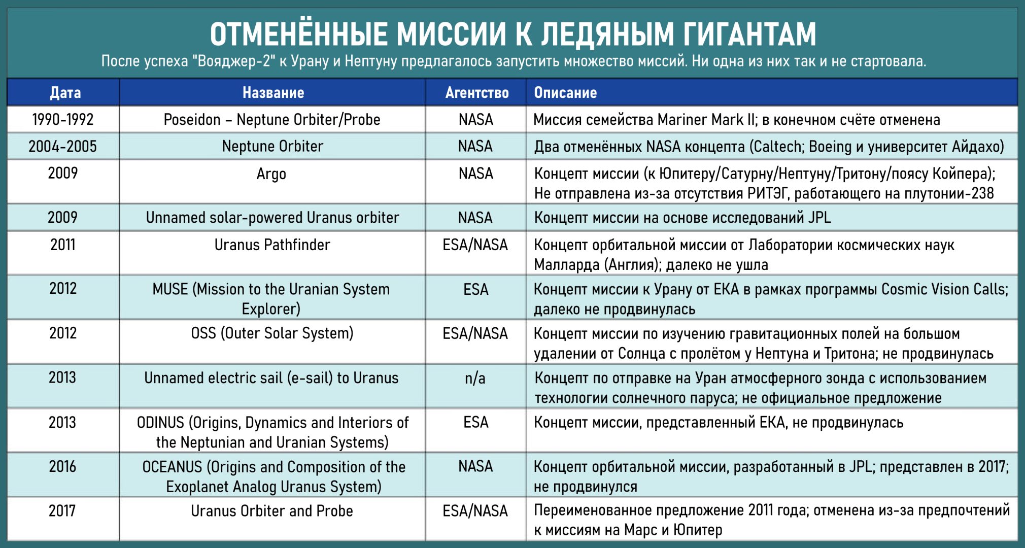 За прошедшее с 1989 года время было предложено около дюжины концепций миссий по изучению ледяных гигантов. Ни одна из этих концепций не прошла в стадию реализации из-за банальной вещи: отсутствия научного интереса. Сообщество учёных-планетологов к ледяным гигантам относилось прохладно.