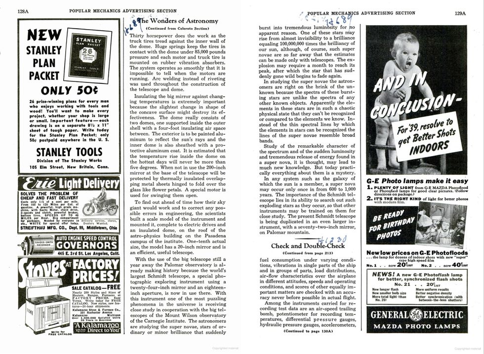 В февральском номере журнала “Популярная Механика” от 1939 года рассказывалось о наиболее совершенном телескопе той эпохи, который находился на горе Паломар, к юго-востоку от Пасадены. В те времена этот телескоп мог собирать в четыре раза больше света и мог “видеть” в два раза дальше любого другого телескопа из когда-лидо построенных. Паломарская обсерватория остаётся действующим исследовательским центром вот уже более 80 лет.