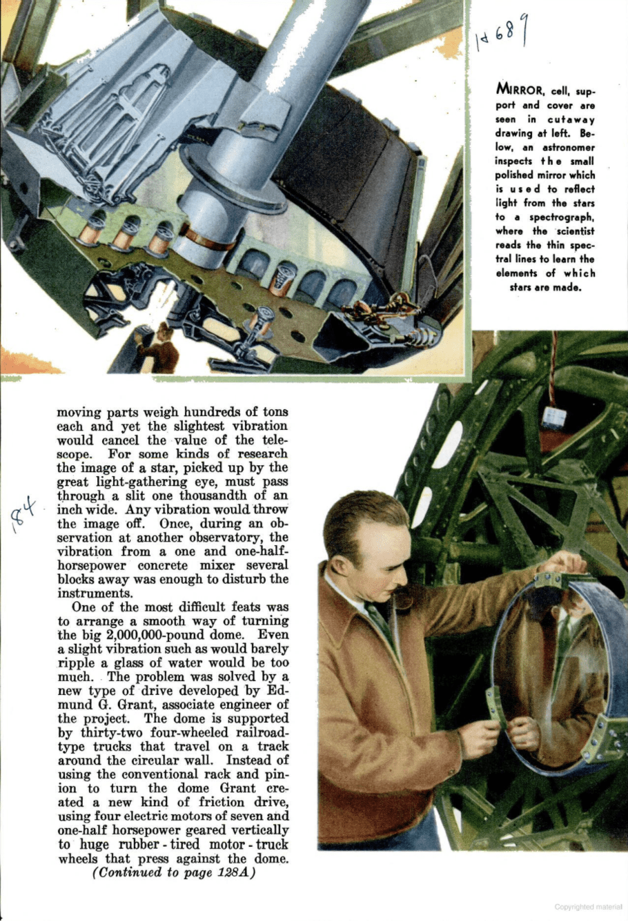 Уже через год самый могучий телескоп о котором мы только могли мечтать – гигант, стоимостью 6 миллионов долларов, который было “невозможно построить” – будет прочёсывать небеса, внося новый вклад в человеческие знания. Огромный 500-сантиметровый рефлектор, принадлежащий Калифорнийскому технологическому институту, начнёт работу в конце 1939, или в начале 1940 года, значительно опережая график.