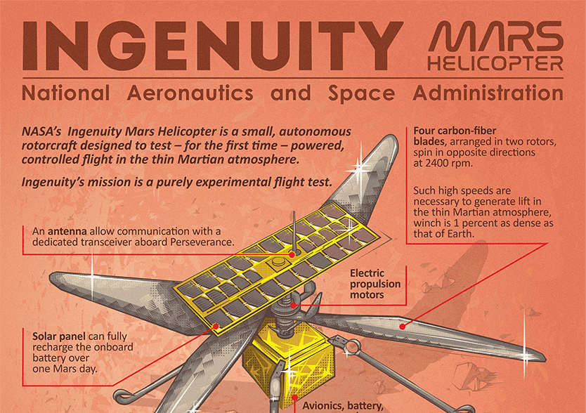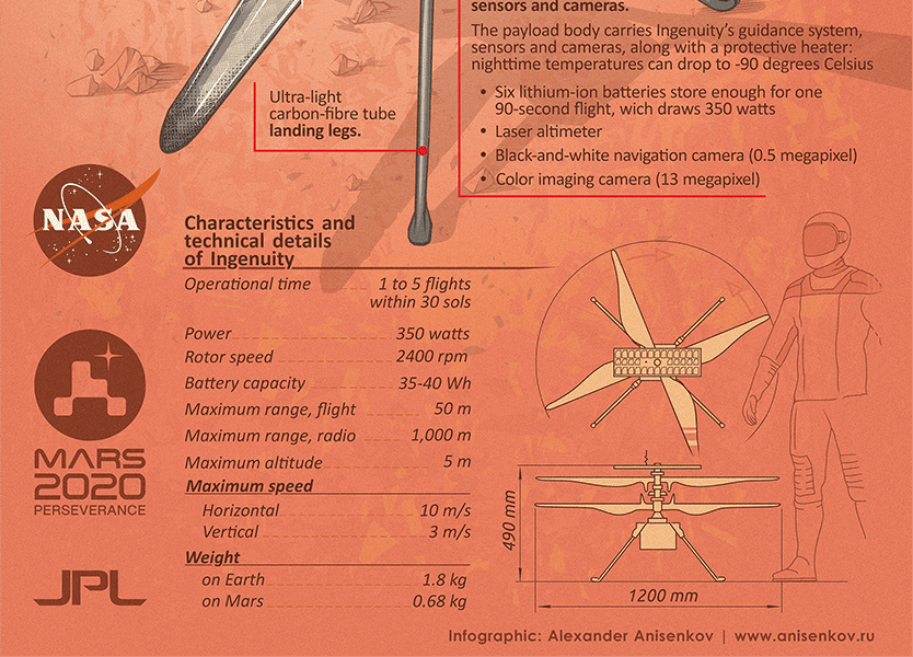 Он, безусловно, важная, но, как по мне, не самая интересная часть мисси Mars 2020 – шасси как у Curiosity с небольшими изменениями, да новый набор научного оборудования. Внешне всё более или менее то же самое. А вот чего в истории космонавтики ещё никогда не случалось, так это испытания специального вертолёта – Ingenuity.