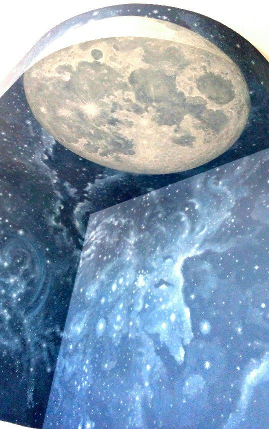 Луна кажется из далека светлым кругом, но если рассматривать ее вблизи видны катастрофические последствия ударов метеоритов, превративших её поверхность в весьма суровый ландшафт. Тогда создается совсем другое впечатление. Недавно так получилось у меня, когда я нарисовал почти полтора метровую Луну на потолке и понял что это выглядит страшно, особенно в тени. Поэтому пришлось слегка избавиться от лишнего объема, но что поделать – все-таки Луна это Луна как её не поверни со всеми кратерами, провалами, разломами и горами. Фотографии с разных ракурсов.