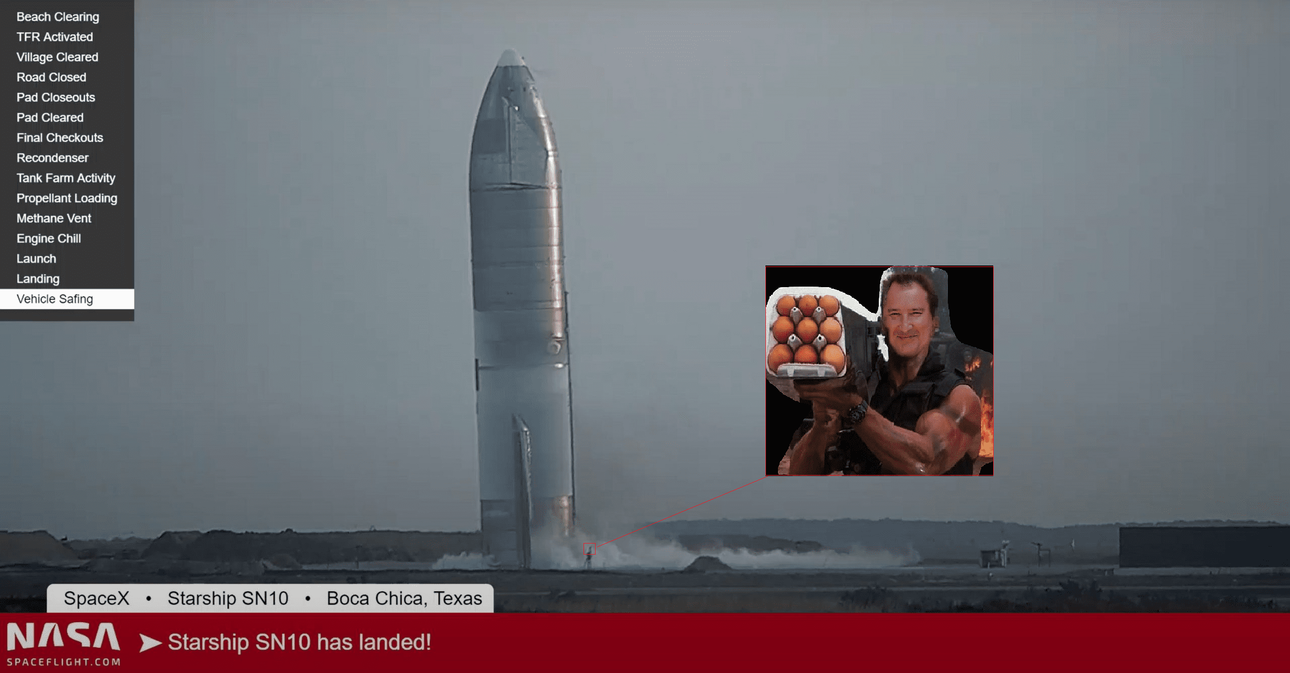 Видео и фото посадки SN 10 уже хватает. Да и то, что произошло после – тоже. ИМХО – это был значительный успех. Даже больше, чем может показаться. Не сам факт посадки, а то как это было сделано. Да, это шаг вперёд – относительно успешная посадка. Почему относительно? – потому что она не была мягкой. Был сильный удар. Можно гадать о причинах, но эта запись на другую тему.