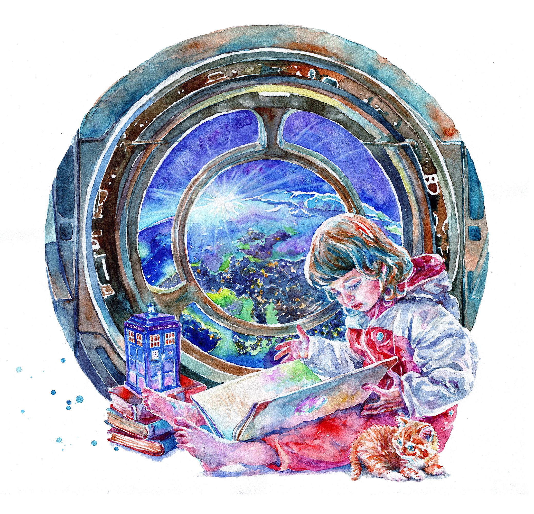 Образ маленькой девочки, путешествующей в одиночку по просторам Вселенной, давно рвался на бумагу и наконец нашел своё воплощение в акварели. Пара-тройка пасхалок тоже присутствуют — рыжий котёнок явно здесь не случайно…