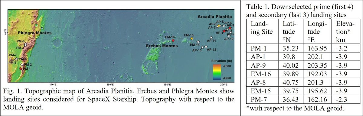 Изначально SpaceX рассматривала четыре региона для посадки: Deuteronilus Mensae, Phlegra Montes, Utopia Planitia и Southern Arcadia Planitia. К марту 2021 года SpaceX провела несколько семинаров по выбору 4 основных() и 3 второстепенных() потенциальных мест посадки во Флегра-Монтес , Эребус-Монтес и Южная Аркадия-Планиция для дальнейшего изучения: