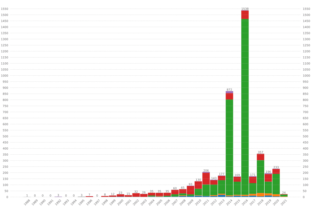 Поймать планету непросто, поймать планету можно разными способами. Здесь показано количество открытий внесолнечных планет за год до 2020 года, с цветами, указывающими метод обнаружения: