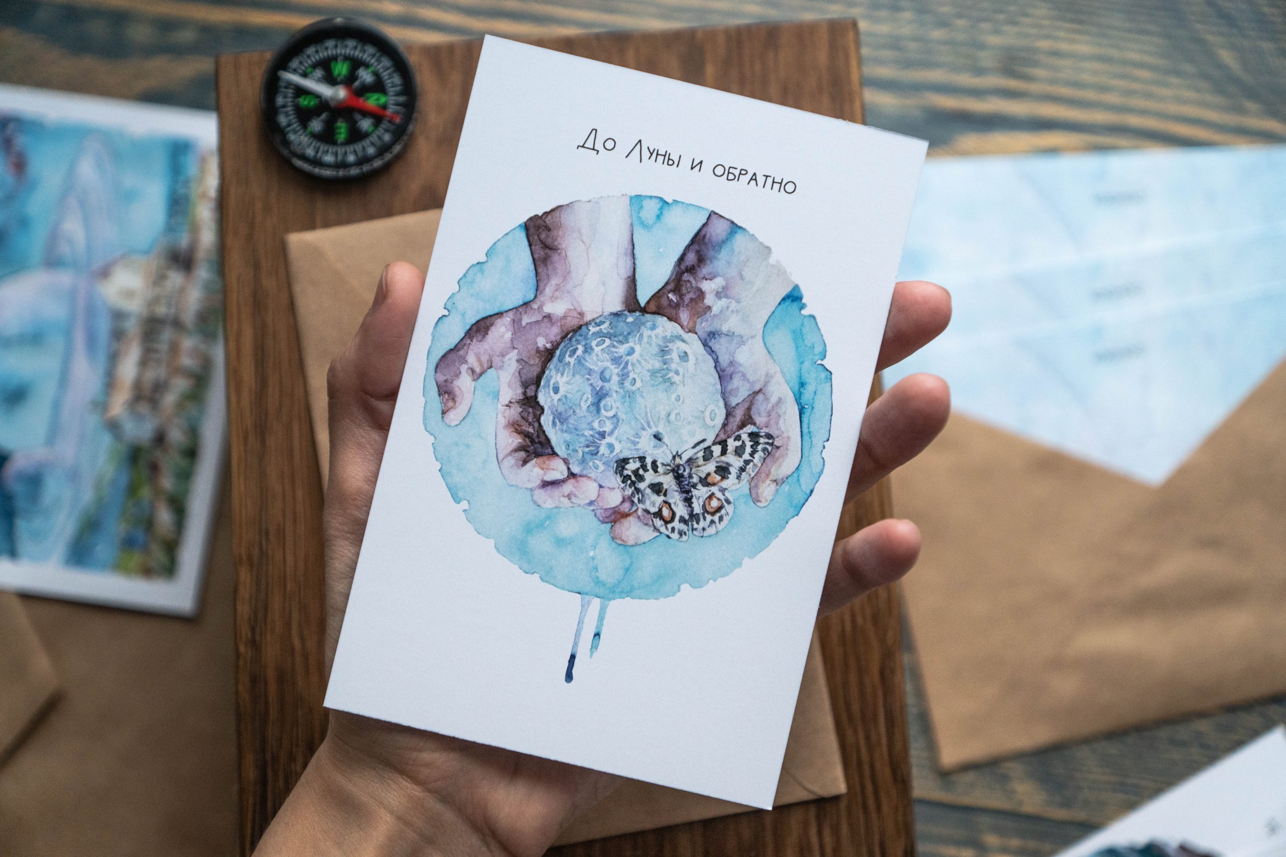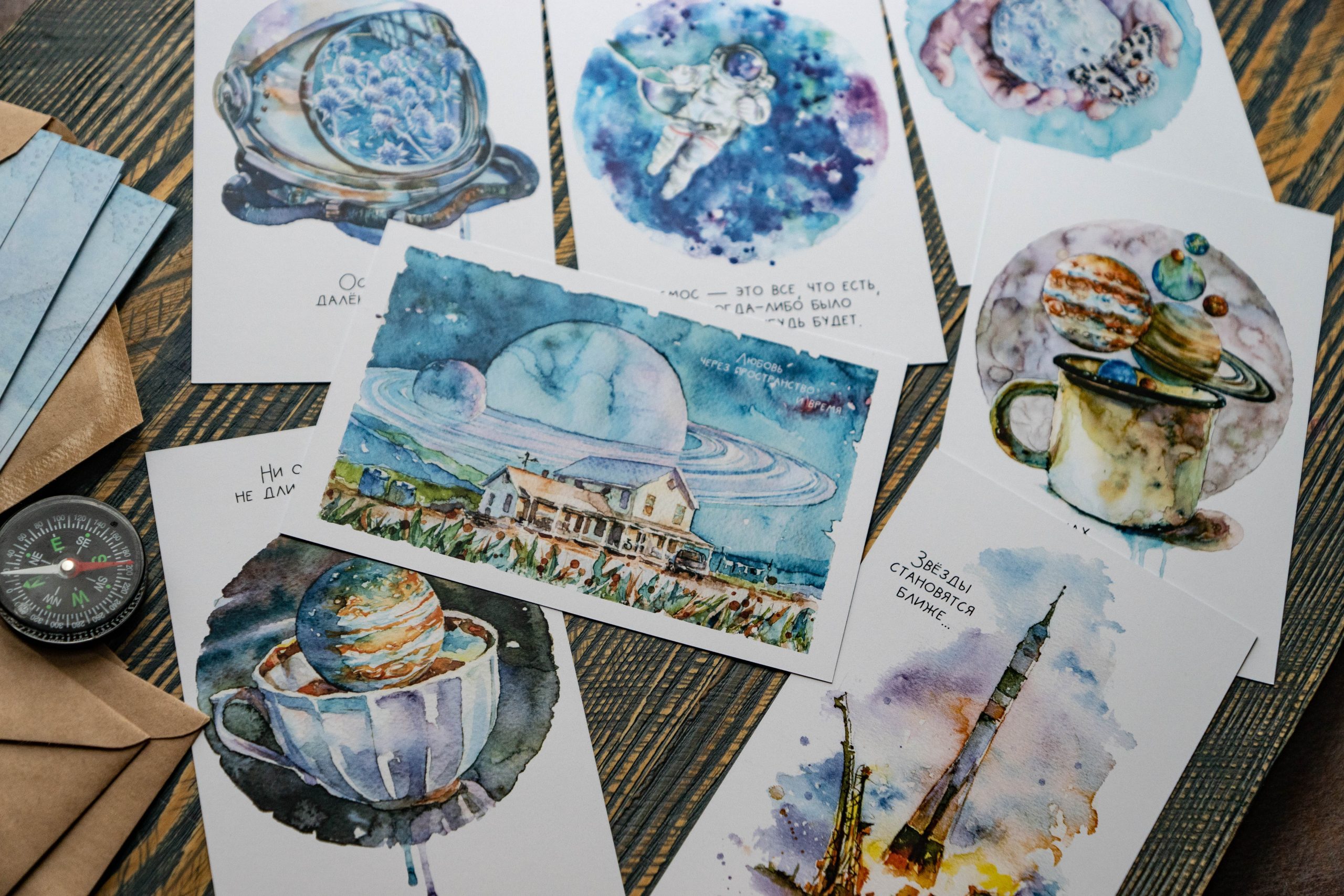 Создала небольшой набор почтовых открыток. Каждая иллюстрация написана акварелью, цифровые сканы напечатаны на дизайнерском картоне в типографии, в общем — полноценные открытки, которые можно отправлять в кругосветку. Сейчас сижу и раздумываю над иллюстрациями к следующей коллекции.