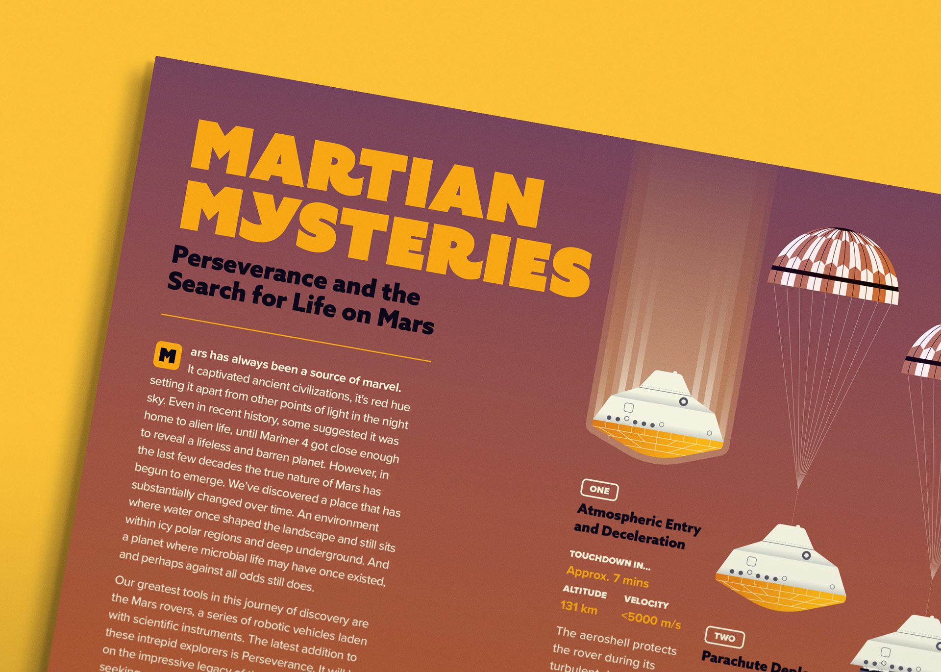 Информация о процессе посадки марсохода Perseverance, описание камер и исследовательского оборудования, установленных на ровере, а так же краткая справка по предыдущим роверам, исследовавшим Марс.