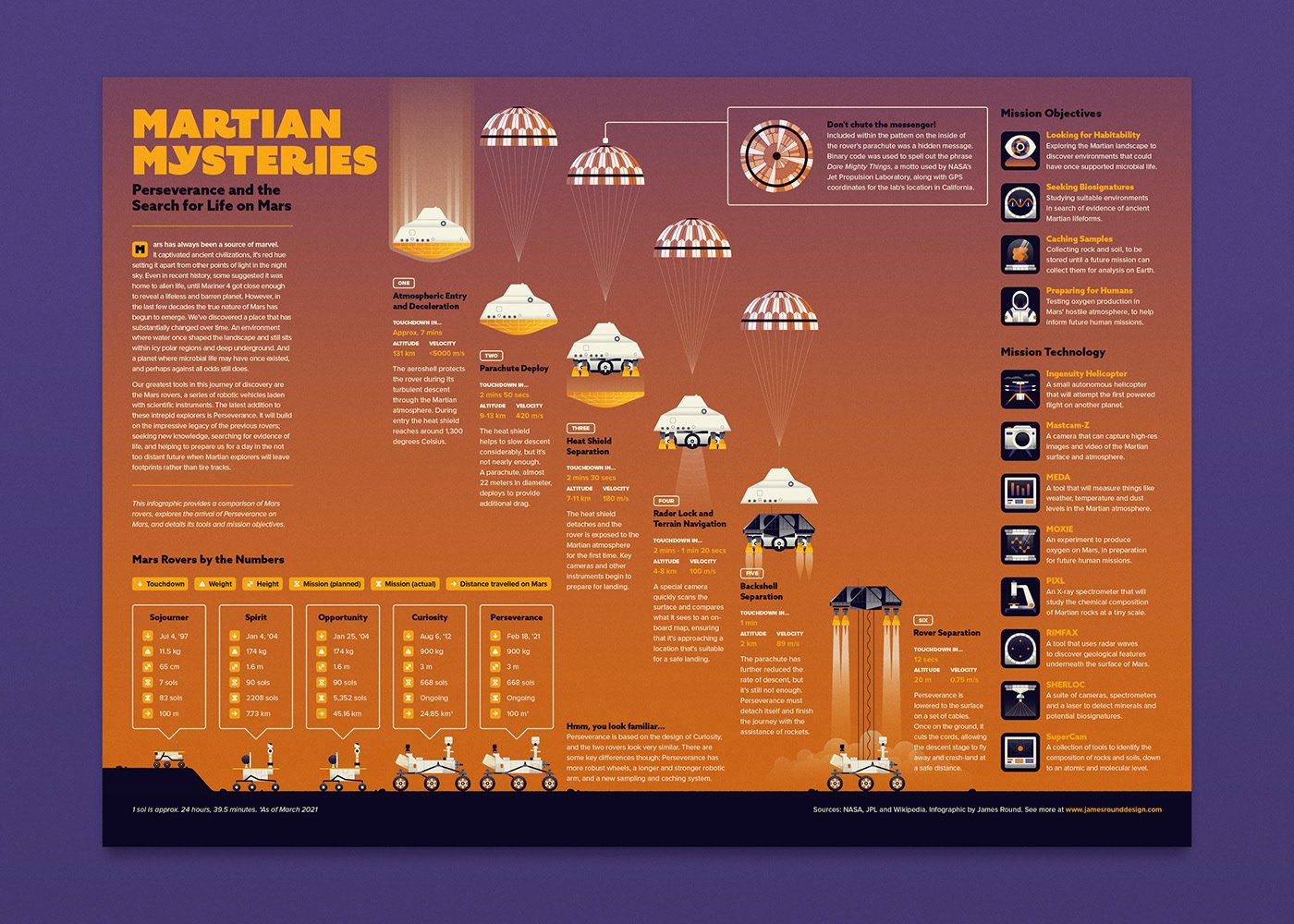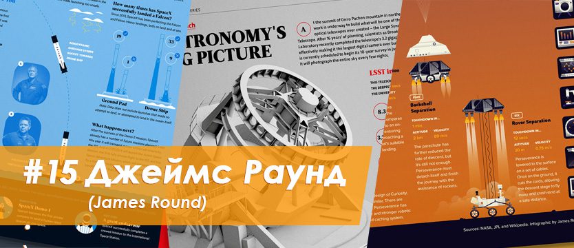 В отличие от них у Джеймса Раунда другая специализация — графический дизайн. Он отлично справляется с наглядной организацией и визуализацией больших объёмов данных. Многие из его работ посвящены астрономии, освоению космоса, и космической технике.