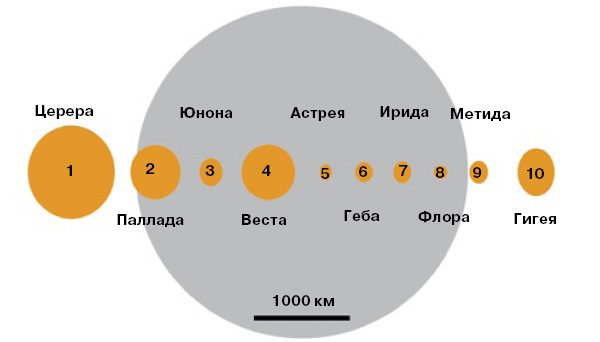Десять астероидов, расположенные в порядке их открытия. Для наглядности астероиды показаны в масштабе кружочками соответствующего размера на фоне круга с диаметром Луны.