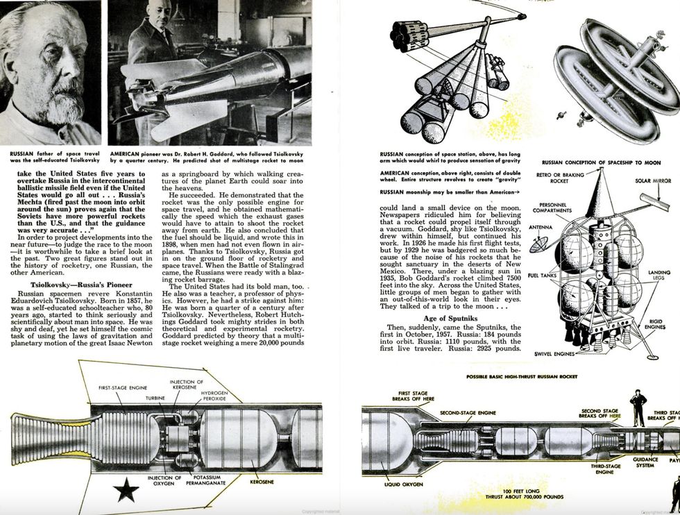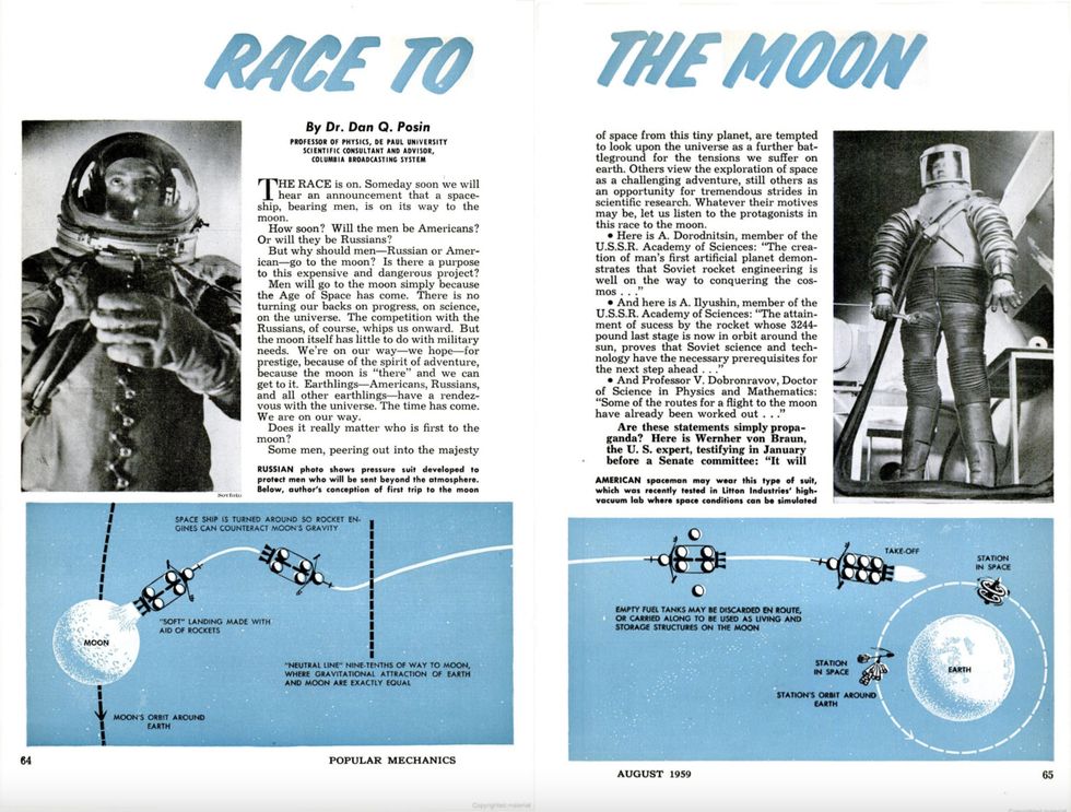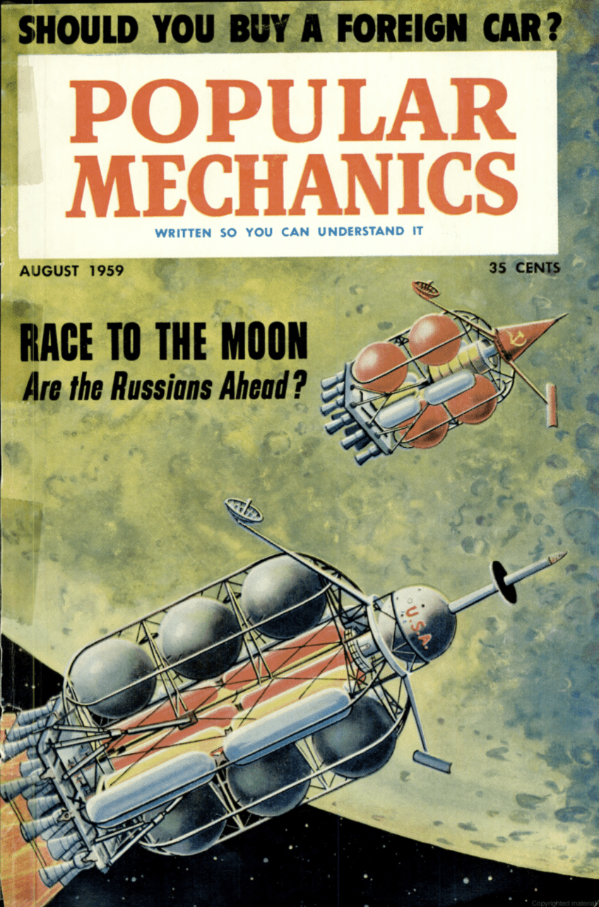 В номере «Популярной Механики» за 1959 год рассказывалось о всё растущей тенденции космических исследований, которые в дальнейшем определят 1960-е годы – «Космической Гонке». Всего за два года до неожиданного запуска «Спутника» Соединённые Штаты, и недавно перевоплотившиеся NASA, изо всех сил пытались не отставать от советских космонавтов. За десятилетие перед высадкой человека на Луну космическая гонка выглядела совсем иначе, нежели в итоге разыграется в ближайшие годы.