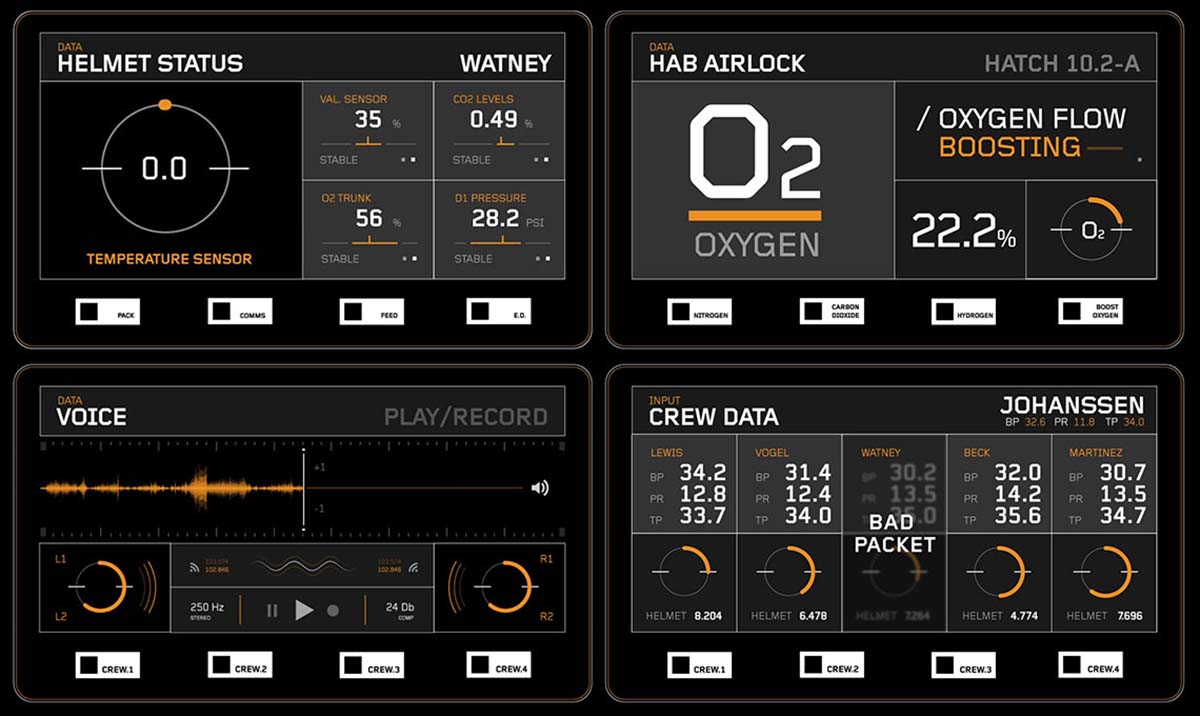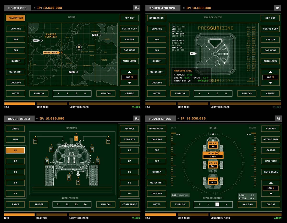 Для марсианина сделано какое то бесконечное количество экранных интерфейсов, причём они везде немного отличаются — интерфейс скафандра не похож на интерфейс марсохода, а вместе они отличаются от интерфейсов взлётной капсулы или корабля.