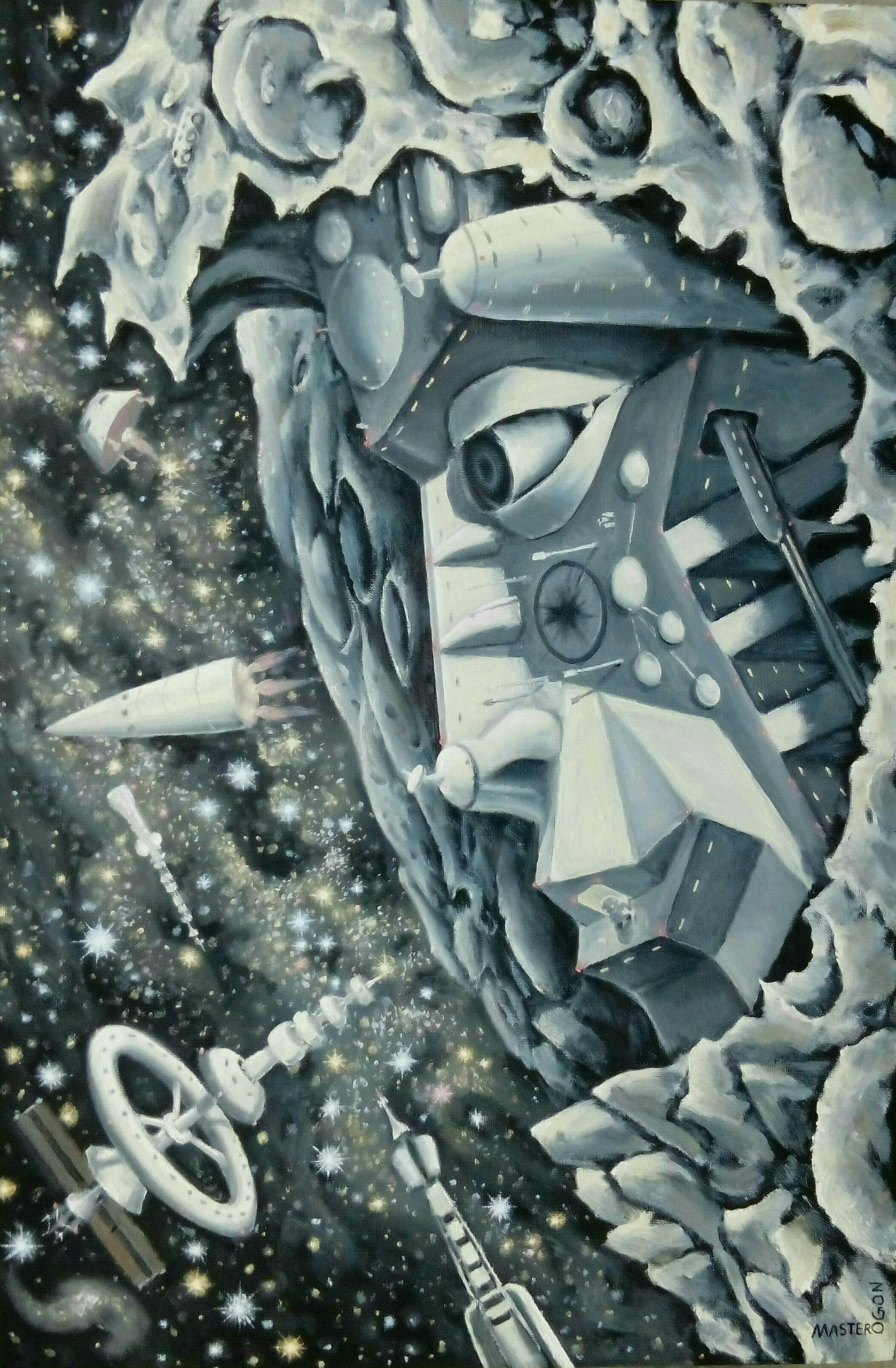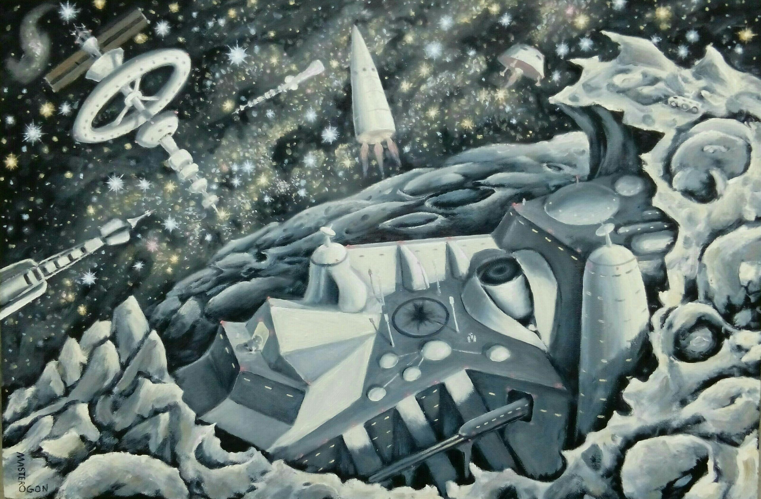 Совсем не собирался Маска рисовать. Просто появилось время рисовать что хочется, вот и не упускаю возможность, рисую космос один за другим. Всегда восхищаюсь разными фантастическими и космическими артами, не раз пытался нарисовать что-то серьезное, реалистичное. Но сколько не стараюсь придумать сюжет для такой картины, никак не могу обойтись без какого-то смысла и иронии, которые напрочь убивают всю серьезность. Вот решил нарисовать сюрреалистичный город на Луне, и не смог отделаться от навязчивого ощущения что он похож на Илона Маска. Да и стиль еще такой, его фирменный что ли. Ну Маск так Маск. Бывает город-герой, а это город-космонавт Илон Маск. Холст, масло, 90 х 60 см.