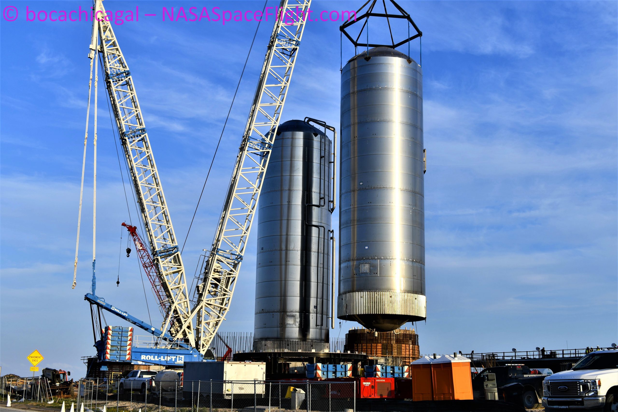 Если март можно было назвать месяцем испытаний, то апрель — месяцем строительства. Так, в марте завершили обустройство суборбитальной площадки и готовили основу для орбитальной. В апреле же вплотную занялись инфраструктурой орбитального стартового комплекса. В самом начале месяца был установлен первый бак орбитального комплекса (GSE1), а спустя 2 недели — второй (GSE2). Сейчас практически готов уже третий такой бак, GSE3. Эти баки изготавливают из тех же деталей, что и сами Starship.