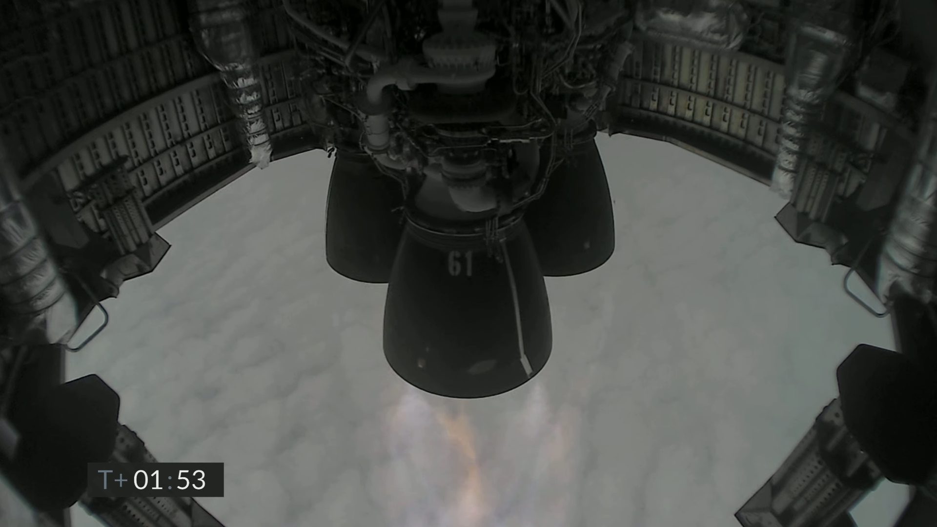 Одна из камер, как и в предыдущих испытаниях, была установлена под “юбкой” корабля, около трёх двигателей Raptor. Судя по картинке с неё, во время старта компании удалось избежать проблемы, которая повторялась во время предыдущих стартов: около трубопроводов двигателей пламени на этот раз не было.