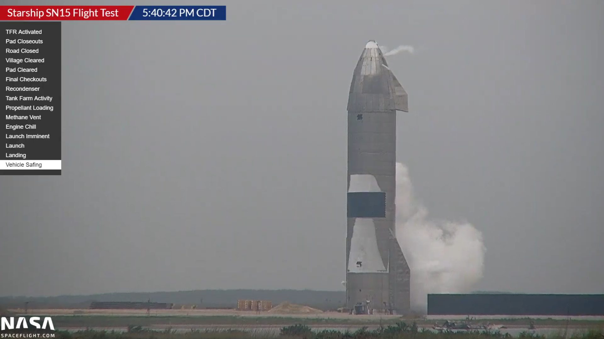 В ночь с 5-го на 6-е мая прототип корабля SpaceX Starship SN15 успешно приземлился на посадочной площадке после полёта на 10 километров. Запись трансляции компании, увы, даёт не очень много информации, так как картинка периодически прерывалась и без помех зрители смогли наблюдать только моменты старта и посадки прототипа, но не включений/выключений двигателей.