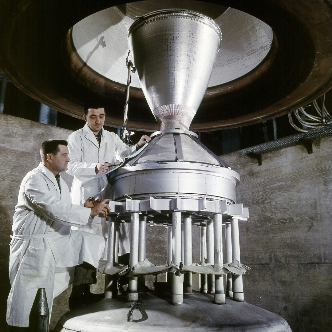 Май 1964-го года. Техники готовят сопло прототипа ядерного ракетного двигателя Kiwi B-1 в вакуумной печи к стендовым испытаниям. Credit: NASA.