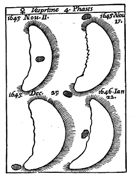 Я увидел две маленькие точки, сопровождающие Венеру, которые, как я предположил, были её придворными и спутниками, так же, как и те, что принадлежат Юпитеру и Сатурну. Это новое открытие, которое, как мне кажется, ещё не было опубликовано. Необходимо заметить, что они появляются не всегда, но лишь когда Венера мерцает, как это будет ясно из схем, и эти маленькие точки всегда кажутся имеющими красноватый оттенок. Эти маленькие точки, однако, не всегда видны в том же положении по отношению к Венере, но движутся взад-вперёд, как рыба в море. Из этого можно заключить, что и сама Венера движется подобным образом и не прикреплена ни к какой части неба