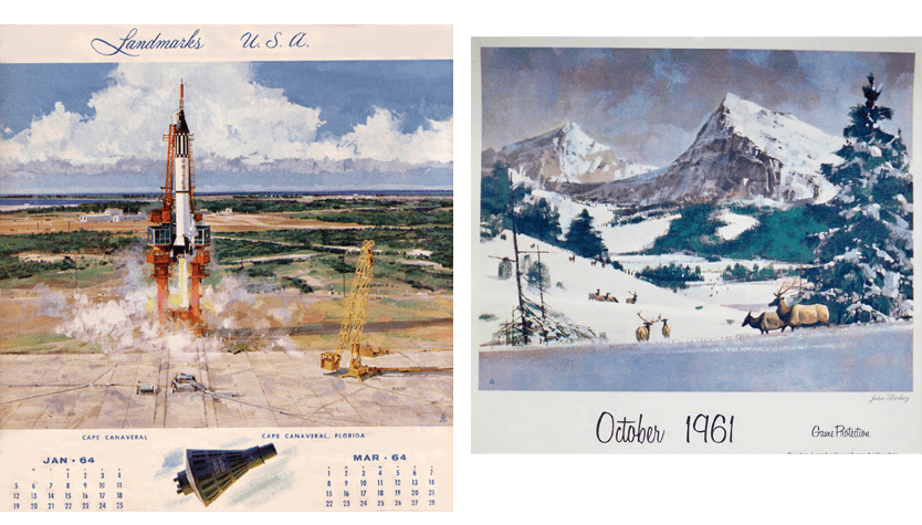 Совершенно невозможно было в начале 60-х быть иллюстратором в подобной отрасли и обойти стороной космическую программу. И наряду с пасторальными пейзажами заснеженной Аляски, избушками первопроходцев и пасущимися оленями, появляются болота Флориды и стартующие ракеты, центр управления полётами и инженеры, колдующие над капсулой спускаемого аппарата.