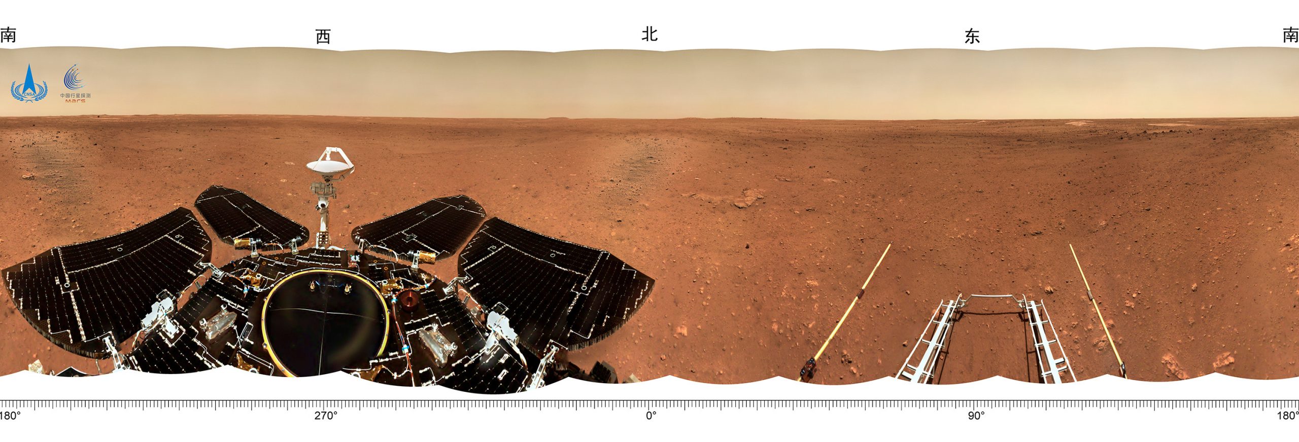 Китайское национальное космическое управление провело в Пекине церемонию показа первой партии научных изображений и обнародовало сегодня, 11 июня, четыре снимка, сделанных автоматической миссией “Тяньвэнь-1”. На них показан марсоход “Чжужун” на поверхности Марса и место мягкой посадки аппарата.