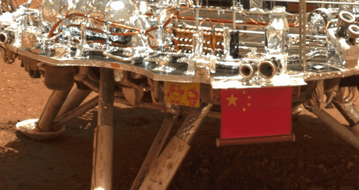 На изображении посадочной площадки виден тканевый национальный флаг Китая и монохромный рисунок талисманов зимних Олимпийских игр 2022 года и Паралимпийских зимних игр в Пекине. Также на этой фотографии хорошо видны следы марсохода на поверхности равнины Утопия.