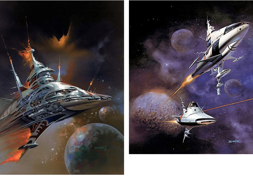 Ну, и как талантливому художнику-иллюстратору в 60-е – 80-е не проскочить мимо Арт Программы NASA, так и художнику, рисующему фантастику, трудно пройти мимо двух известнейших космических кинофраншиз — “Звёздные войны” и “Стартрек”.