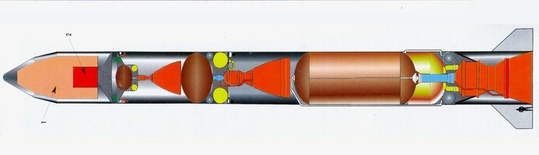 Двигатели были максимально простые – никаких насосов, никаких активных систем охлаждения, никаких приводов для качения камерой. Подача топливной пары осуществлялась вытеснением газом из баков, охлаждение – абляционное (камеры наматывались из стеклопластика), а изменение вектора тяги – путём впрыска горючего в сопловую часть, хотя есть данные, что на первой ступени должны были стоять газовые рули.