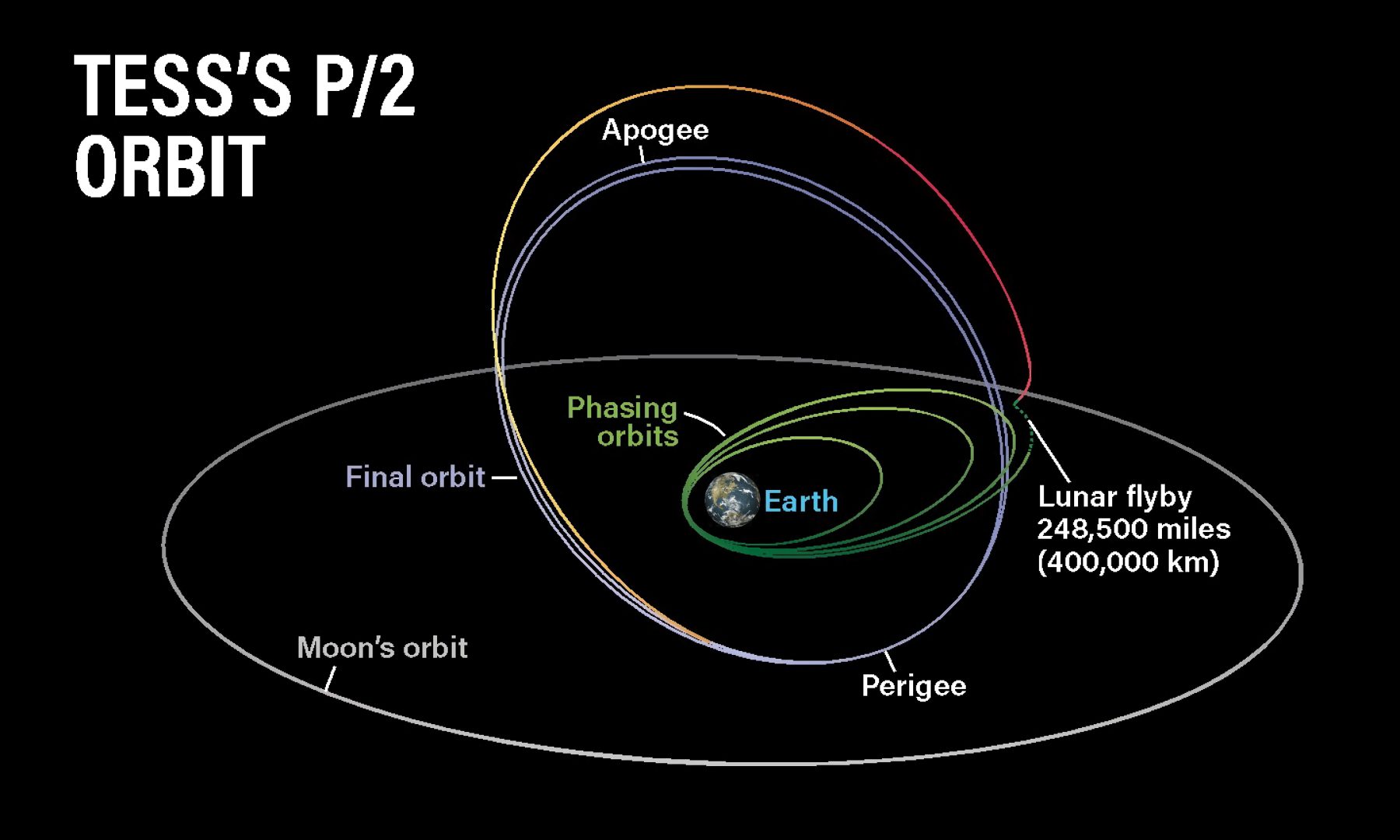 Уникальная орбита TESS с периодом 13,7 суток приводит телескоп в резонанс 2:1 с Луной – космический аппарат совершает два оборота вокруг Земли, пока Луна выполняет один. В ходе движения по орбите TESS приближается к Земле на расстояние 107 800 километров в перигее и удаляется на расстояние 373 400 километров в апогее. Чтобы достичь такой орбиты, телескоп прошёл путь через три переходные орбиты и облёт Луны. На свою окончательную орбиту P/2 аппарат прибыл через 42 дня после запуска. Credit: Astronomy: Roen Kelly, after Ricker et al. (2014).