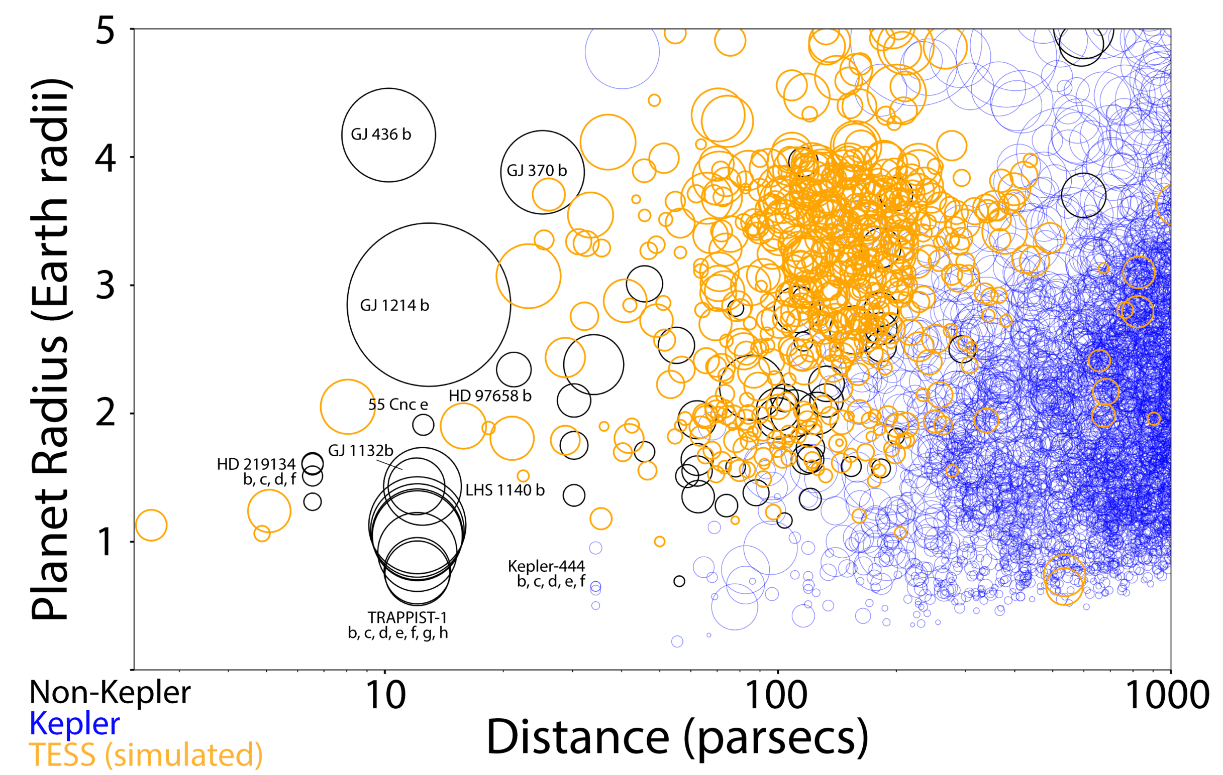 Миссия TESS выполняет уникальную задачу, выявляя малые внесолнечные планеты с радиусом, в несколько раз превышающим радиус Земли, вокруг близких и ярких звёзд. Доступность материнских светил позволяет исследователям быстрее и легче отслеживать вновь открытые планеты с помощью наземных и космических телескопов. Credit: Thomas Barclay, Joshua Pepper, Elisa V. Quintana / A Revised Exoplanet Yield from the Transiting Exoplanet Survey Satellite (TESS)