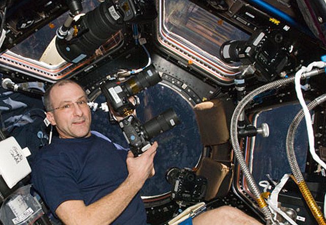 Астронавт НАСА Дональд Петтит работает с двумя совмещёнными камерами в модуле «Купола». Credit: NASA